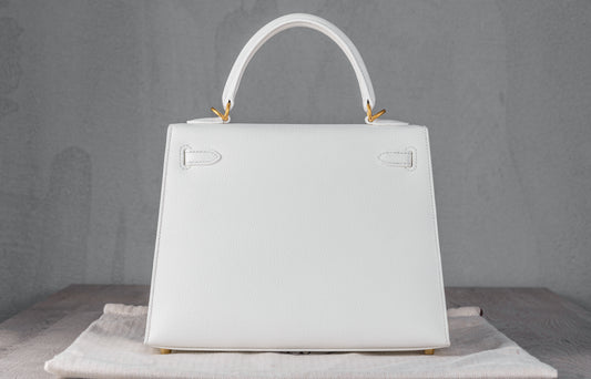 Hermès K25 Kelly II 25 Sellier Bag in HSS White Epsom Leather w/ Grey Stitching and Brushed Gold Hardware
